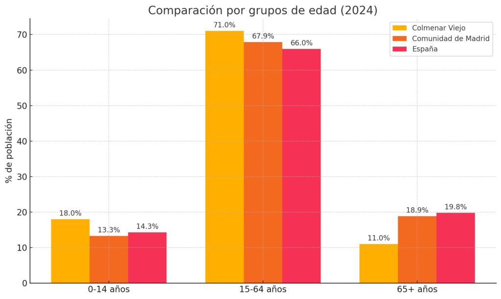 Estos datos refuerzan la idea de que Colmenar Viejo no solo es un municipio atractivo para nuevas familias, sino que su estructura demográfica favorece la sostenibilidad del sistema local de servicios, educación y empleo. Mientras España y la Comunidad de Madrid enfrentan un envejecimiento progresivo, Colmenar sigue creciendo con una base sólida de población joven.