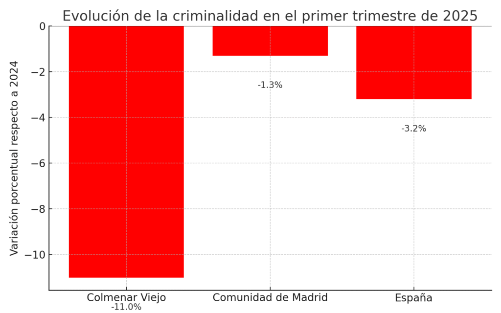 Este retroceso contrasta positivamente con las cifras regionales y estatales. En la Comunidad de Madrid, el descenso ha sido del 3,5%, mientras que a nivel nacional la bajada se sitúa en el 2,8%. El comportamiento de Colmenar Viejo demuestra una mejora sostenida en la seguridad, muy por encima de la media.
