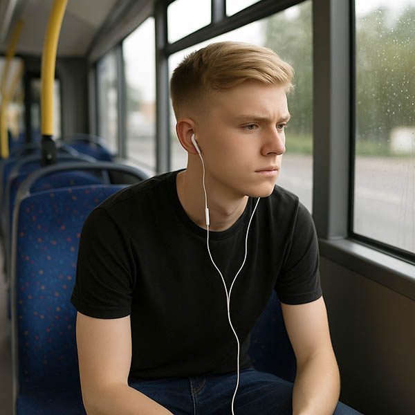 Subió en la parada de la Avenida de Madrid, con una mochila colgando de un solo hombro y la mirada escondida tras unos cascos grandes. Tenía unos 16 o 17