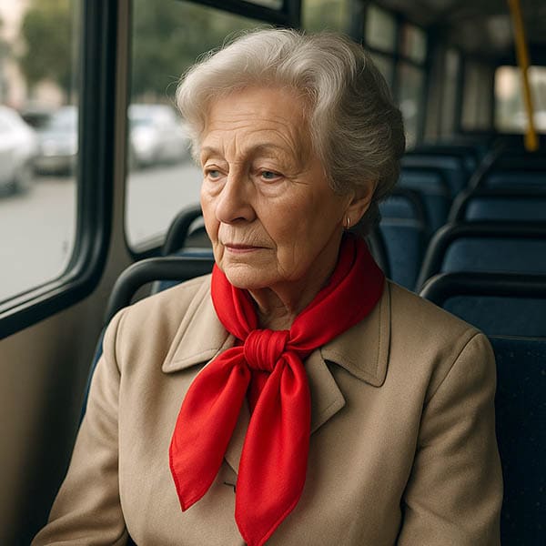 Subió en la parada del Zoco. Era bajita, arrugada y elegante, con un pañuelo rojo anudado al cuello. Se sentó sin mirar, suspirando como quien carga una mochila invisible. El
